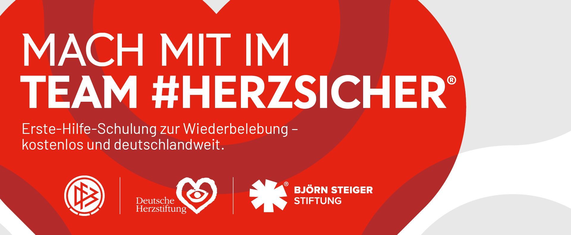 Die bundesweite Initiative #Herzsicher ist ein Kooperationsprojekt der Björn Steiger Stiftung, der Deutschen Herzstiftung und des Deutschen Fußball-Bundes. Gemeinsam schaffen wir ein flächendeckendes Angebot an kostenfreien Erste-Hilfe-Schulungen zur Wiederbelebung und zum Einsatz von AED-Geräten (Automatisierte Externe Defibrillatoren).